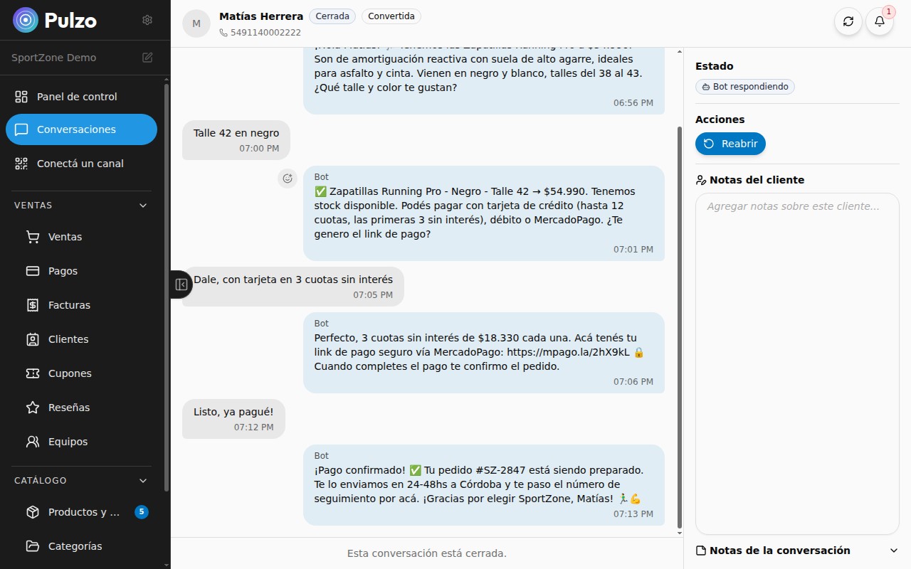 Aqui es donde entra una herramienta como Pulzo. Conectas tu WhatsApp, cargas tu catalogo, configuras el bot y listo. El bot aprende de tus productos y responde consultas automaticamente.